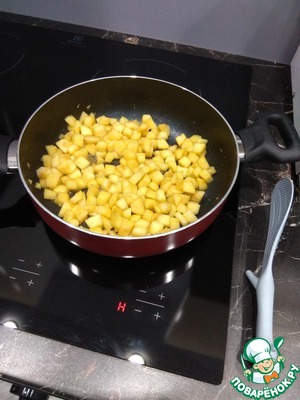 Составляющие нашей начинки. Яблоки вымыть, очистить от кожицы и сердцевины, нарезать небольшими кубиками. В сотейнике растопить масло, выложить яблоки и жарить, аккуратно помешивая 3-5 минуты. Добавить сахар, готовить ещё 2-3 минуты.