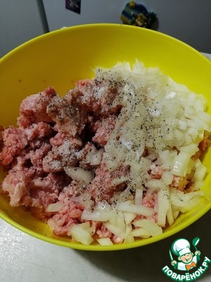 В миску к фаршу добавляем лук, черный перец, соль и хорошо вымешиваем до мягкости и однородности.