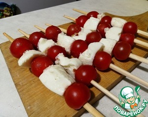 На палочку поочередно нанизываем черри и моцареллу (можно взять сразу шариками, у меня в магазине была куском большим).