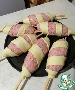 Тесто нарезаем на 6 полосок и раскатываем их подлиннее, затем обворачиваем наши котлетки на палочках и смазываем тесто желтком, отправляем в духовку при 200 градусах на 40 минут.