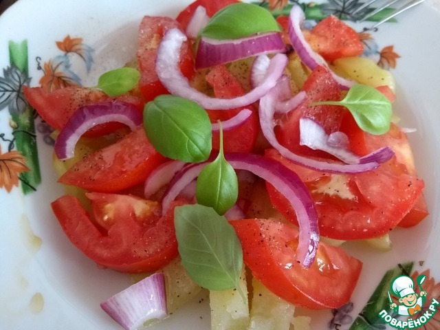 Смешать замаринованые овощи, картофель и нарезаные помидоры.