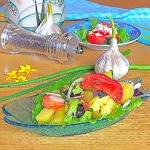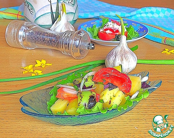 Очищенный перец нарезать на кусочки и замариновать минут на 10 в смеси винного уксуса и масла, солим и перчим по вкусу.