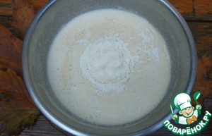 Добавить муку, смешанную с содой.