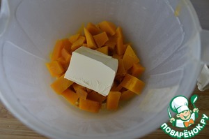 Добавляем к тыкве масло комнатной температуры и всё пробиваем в пюре блендером.