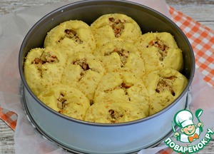 Выложить пирожки в форму для выпечки (d 24-26 см) на небольшом расстоянии друг от друга. Дно формы простелить пекарской бумагой.