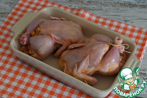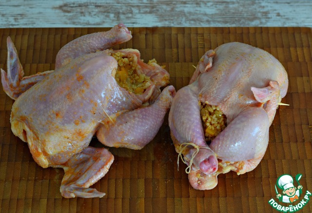 Связать ножки цыплят кулинарной нитью, подколоть крылышки зубочистками. Таким образом цыплята во время готовки не "раскроются" и начинка не выпадет. -