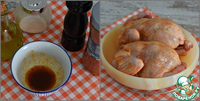 Для маринада смешать черный перец, паприку, соль, чесночный порошок и две столовые ложки оливкового (подсолнечного) масла.