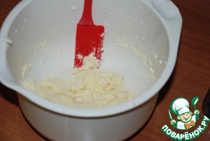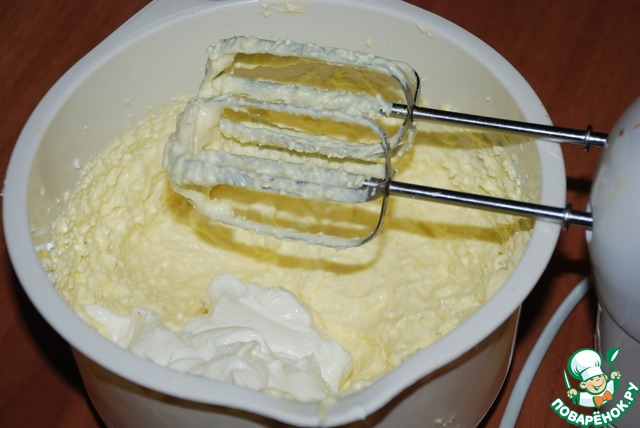 В получившуюся массу вмешиваем творог (можно протереть его через сито).