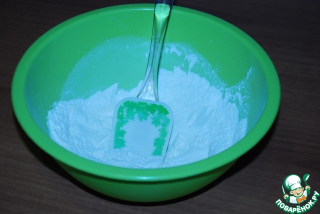 К просеянной муке добавить сахарную пудру, разрыхлитель и тщательно перемешать.