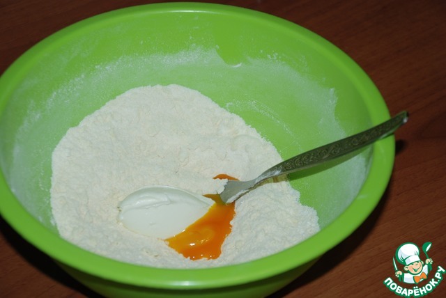 В мучную смесь положить желток одного яйца (белок добавится в творожный слой), сметану и нарезанное кусочками сливочное масло.