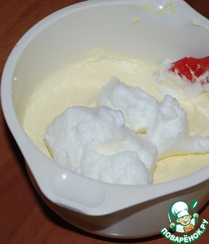 Белки ( 3 шт) взбиваем до крепкой пены и аккуратно подмешиваем к творожной массе.