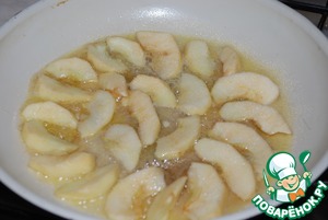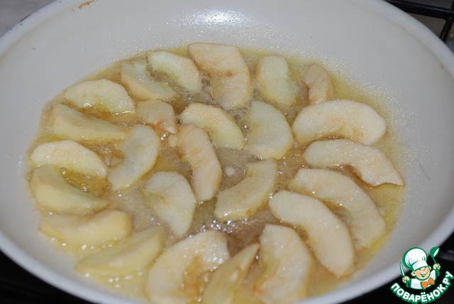 Пока пирог выпекается, делаем карамельные яблоки. На сковороде распускаем сливочное масло, сахар. Кладём очищенные яблоки и на среднем огне держим их до лёгкого зарумянивания с одной и другой стороны.