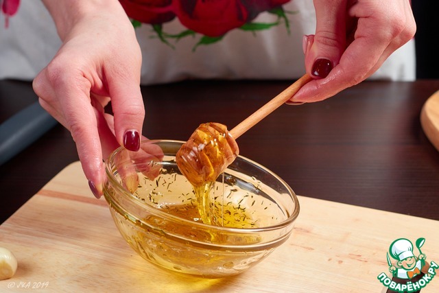 Мясо выложите в форму для запекания, полейте медовой глазурью и поставьте в духовку, нагретую до 220С. Готовность зависит от размера куска и желаемой степени прожарки. У нас полная заняла около 20 мин.