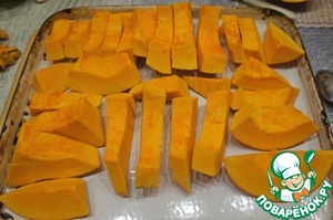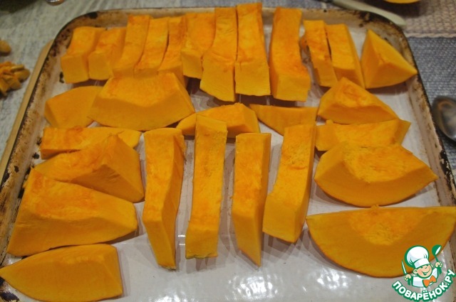 Небольшую тыкву (вот забыла взвесить) вымыть, нарезать на дольки, не очищая от кожуры, разместить на противне и поставить в горячую духовку на 20-25 минут. Можно сверху прикрыть фольгой, чтобы тыква чрезмерно не засохла. Готовую тыкву извлечь из духовки и оставить остывать.
