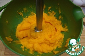 Мякоть остывшей тыквы снять с кожуры и взбить погружным блендером в пюре.