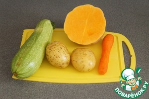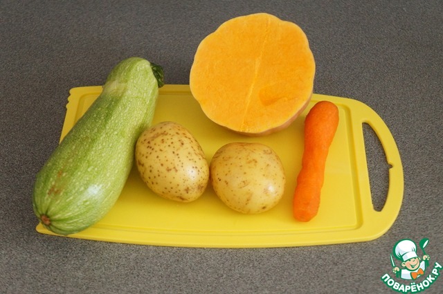 Овощи которые я использовала: кабачки, картофель, морковь и тыква. Можно исключить любой овощ, который не хотите. Можно использовать только кабачки или только картофель. Из одних кабачков блюдо будет особенно нежным.
