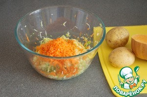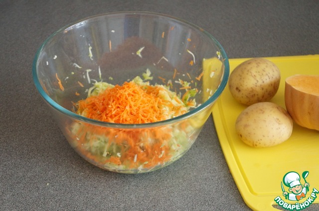 Надо натереть овощи на мелкой тёрке, присолить и через несколько минут хорошо отжать. Понадобится 3-3,5 стакана тёртых отжатых овощей. На форму 20-24 см. Сок (кроме картофельного) можно заморозить и использовать для супа, рагу и т. д.