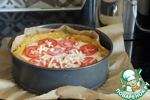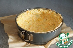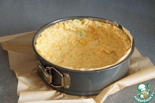 К тёртым овощам добавить 0,5 ст. муки, растительное масло и полчайной ложки крахмала. Выложить в смазанную маслом и застеленную пергаментом форму, формируя бортики и дно.