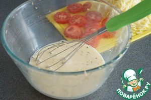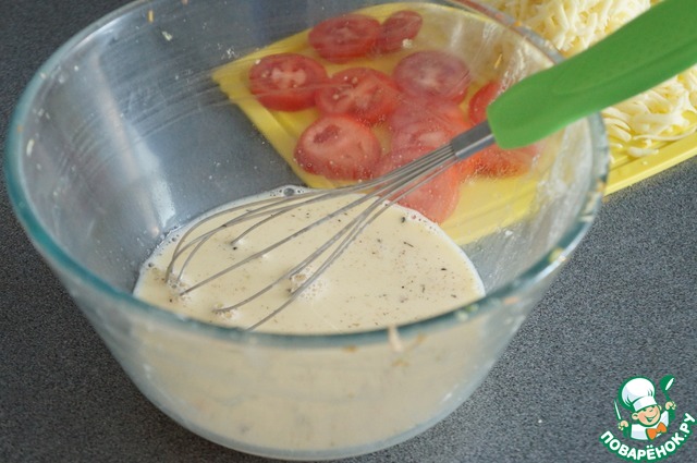 Для заливки смешать яйца, молоко, 0,5 ч. л. крахмала, соль и мускатный орех.