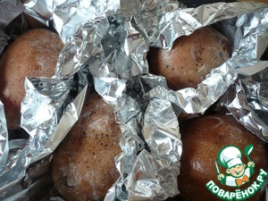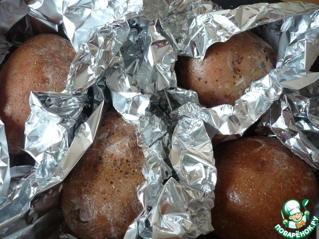 Наколите картофель вилкой со всех сторон и смажьте 1 ст. л. растопленного сливочного масла. Запекайте картофель в духовке на противне при 200 градусов около 1 часа до готовности и нужной мягкости.