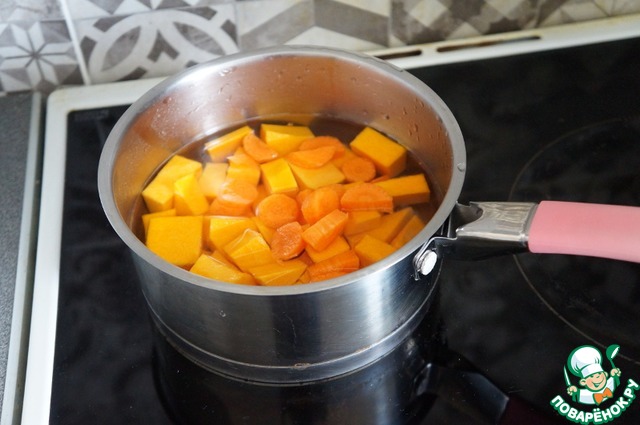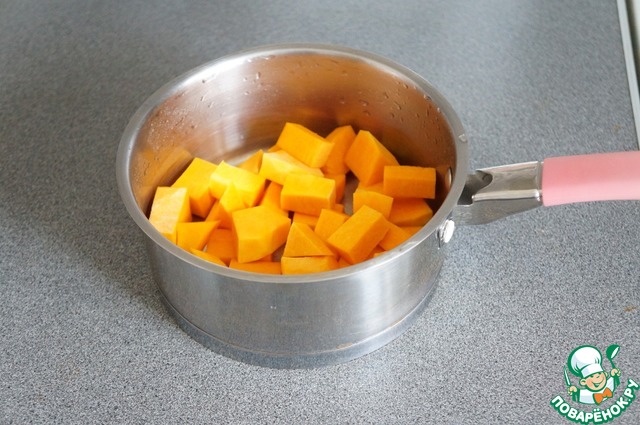 1. Тыкву (у меня сорт Баттернат) нарезать небольшими кубиками, залить водой и поставить вариться.