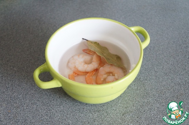 3. Пока варятся овощи, приготовить креветки любимым способом. Можно чуть прожарить на сливочном масле с чесноком. В этот раз я залила кипятком, выдавила чеснок и добавила лавровый лист.