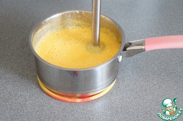 4. Слить воду, в которой варились овощи, отложить. Погружным блендером хорошо перемолоть тыкву и морковь в пюре, влить сливки. Регулировать необходимую густоту отваром, добавив по вкусу.