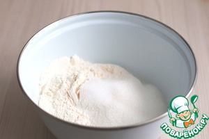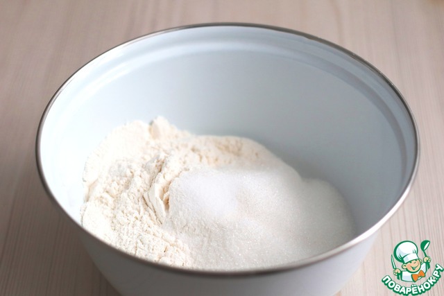 В миске соединить сухие ингредиенты: Муку (300 гр.), соль (1/2 ч. ложки), сахар (100 гр.). Все ингредиенты перемешать.