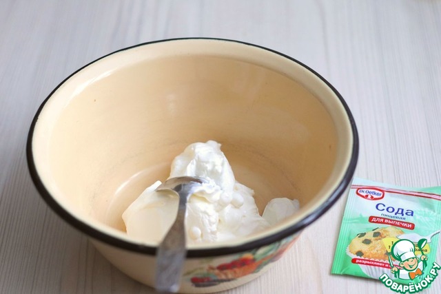 В отдельную миску добавить сметану (150 гр.), соду (1/2 ч. ложки).