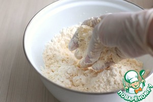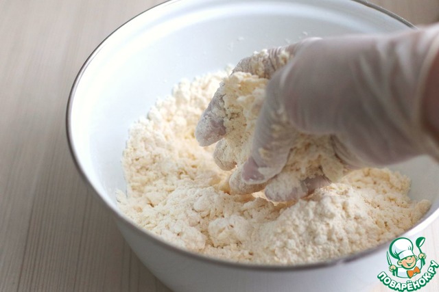 В миску с сухими ингредиентами добавить 100 гр. холодного сливочного масла. Муку и масло перемешать (растереть) руками в крошку. Далее добавить сметанную смесь. Замесить тесто. Тесто завернуть в пищевую пленку и убрать в холодильник на 30-40 мин.