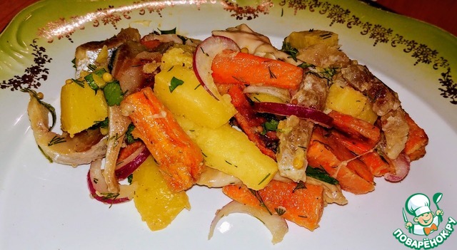 Сложно найти человека равнодушного к селедке... С отварной картошечкой или всем известный салат "под шубой", или даже просто положить на кусочек хлеба... конечно очень вкусно и всеми любимо, причем наиболее вкусна селедочка именно в осенне-зимний период!!)) Сегодня же предлагаю приготовить простой, при этом очень вкусный салат из малосольной сельди с запеченной пряной морковью, картофелем, луком и пикантной заправкой!