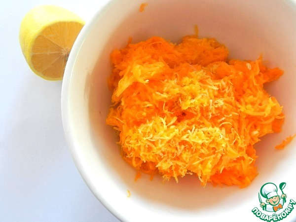 Тыкву натереть на мелкой терке. Добавить цедру и сок 1/2 лимона, перемешать.