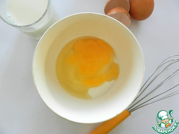 В миске смешать 2 яйца, 100г сахара, 1ч. л. (с горкой) ванильного сахара, 150мл молока и 2 ст. л. растительного масла.