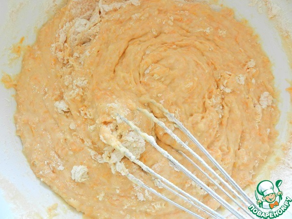 Соединить яйчно-сахарную смесь с тыквой, перемешать и, постепенно добавляя просеянную муку с разрыхлителем и щепоткой соли, замесить тесто. Тесто должно получиться как густая сметана.
