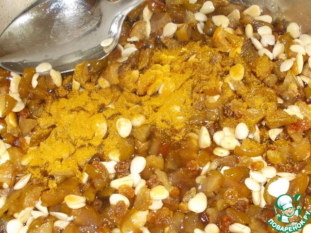 В остывшее варенье добавляем изюм, очищенные ядра абрикосовых косточек, ванилин, корицу, гвоздику и имеретинский шафран. Перемешиваем и ставим на огонь. Доводим до кипения и провариваем 5 минут.