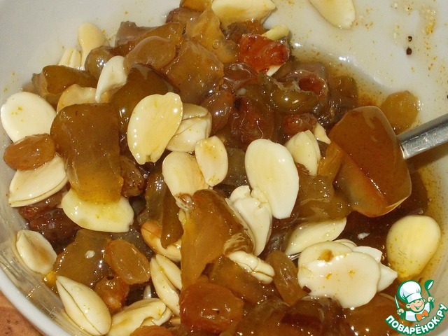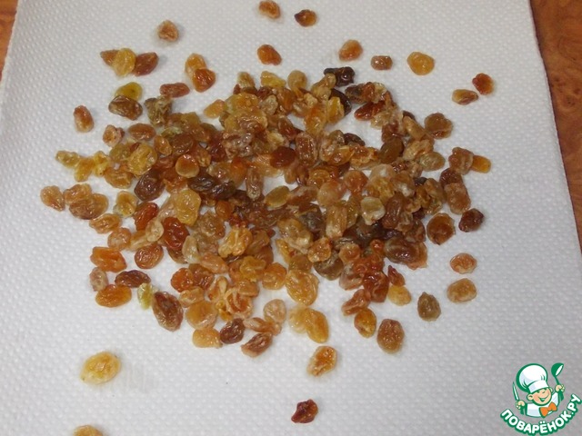 Изюм перебираем, промываем хорошо и замачиваем в горячей воде минут на 10-15. После чего изюм так же выкладываем на бумажное полотенце.