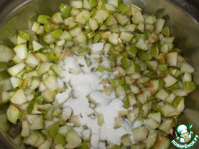 Груши нарезаем мелким кубиком и засыпаем сахаром.