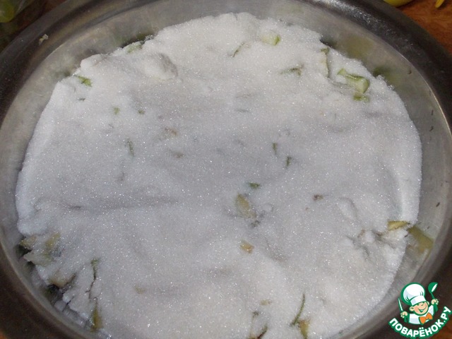 Поверх нарезанных груш высыпаем весь сахар и распределяем по всей поверхности кусочков. Оставляем на часов 5-6, чтоб фрукт пустил сок. Я оставляю на всю ночь.