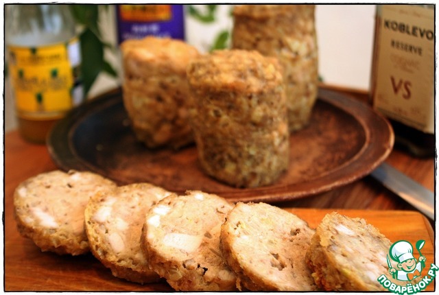 Ингредиенты, которые сложили в процессор хорошо перерабатываем до однородной массы. Затем в получившуюся массу добавляем филе, лук, чеснок, орехи. Если хотите, то лук можно слегка спассеровать или натереть на терке (но в таком случае надо отжать сок, чтоб не было горечи!) Место орехов можно добавить чернослив. Так же очень интересную нотку добавляем коньяк... Его в ингредиентах я не указала, так как конкретно в эту колбасу его не добавляла. Если решите добавить, то 1 ст. л. будет достаточно.