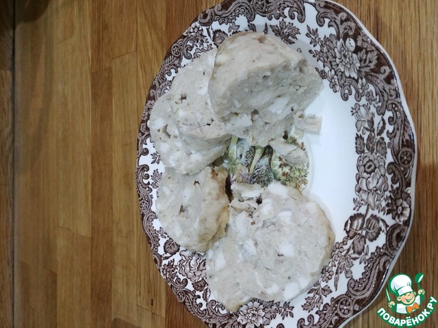 Резать колбасу надо острым тонким ножом. Мне удобнее ножом-пилкой. Обычно она хорошо держит форму и не разваливается, но иногда возле кусочков филе могут образовываться пустоты... Если делать колбасу без кусочков, а полностью из перемолотого фарша, то она более однородная и эластичная. Но нам больше нравится именно с кусочками! Приятного аппетита!