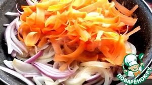 Морковь очистить и нарезать длинными слайсами с помощью овощечистки.