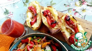 Картофель вначале сварить не полностью. Крупные клубни разрезать пополам, вынуть немного серединку и поместить лук и перец красный или что др. Сбрызнуть маслом. Запечь в духовке до готовности.