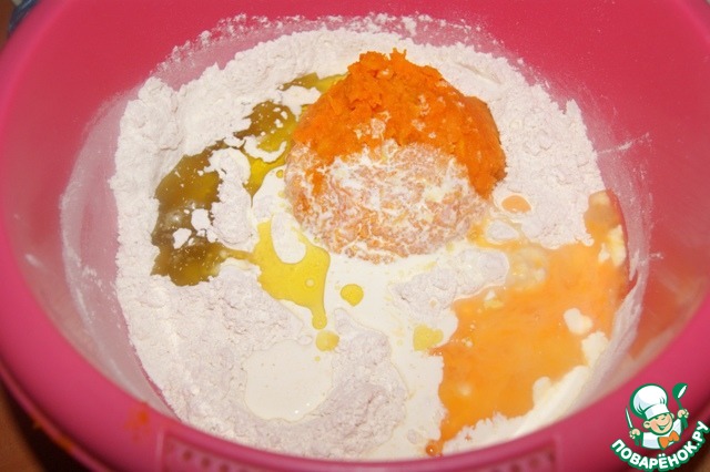 Муку смешать с дрожжами, солью и сахаром. Добавить масло, тыкву, яйцо и сливки.