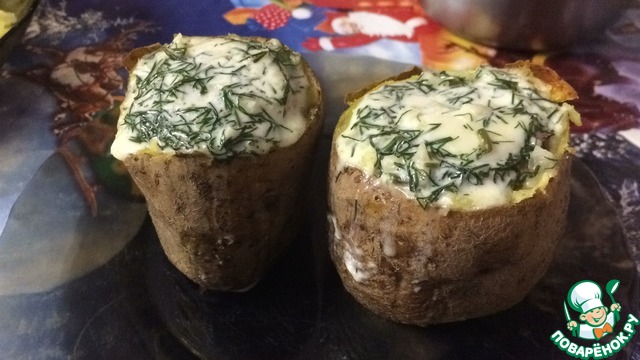 5. В подготовленную картошку выкладываем по 1 ч. л сметанной заправки затем чередуем сардельку и сыр сверху поливаем 1 ч. л. сметанной заправкой. Убираем картофель в духовку разогретую до 180 % на - 5 минут.