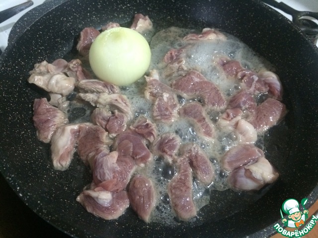 Готовила с говядиной, поэтому тушила мясо с луковицей в мультиварке-скороварке. Так быстрее и говядина всегда мягкая выходит. Просто отличная идея с добавлением целой луковицы, очень много у меня не любителей такого лука. А здесь, действительно, весь аромат остаётся, а лука нет.
