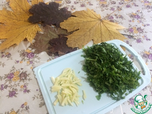 Тем временем измельчаем чеснок и зелень. Я готовила с кинзой, но можно взять любую зелень.