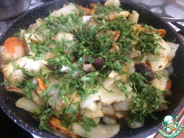 Остальное по рецепту в сковороде. Картошка получилась и поджаренная и нежная. Да и вообще, сочетание и способ приготовления отличный.