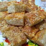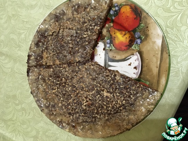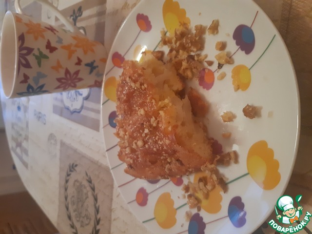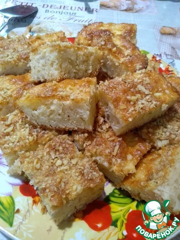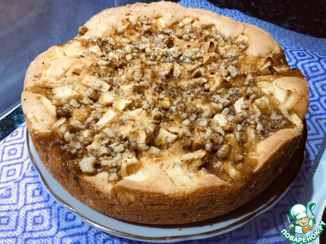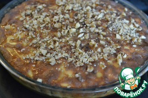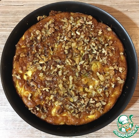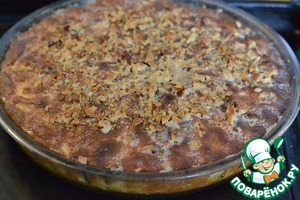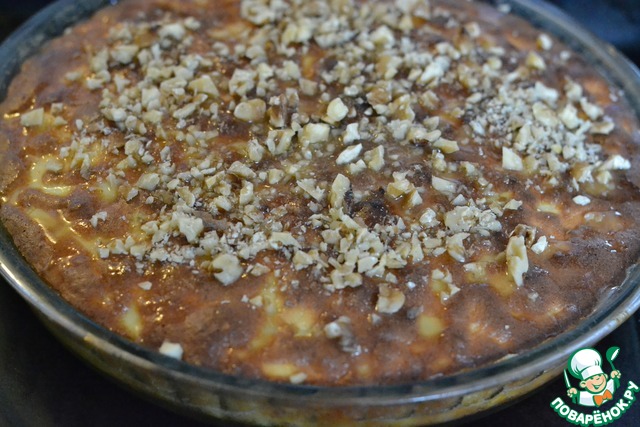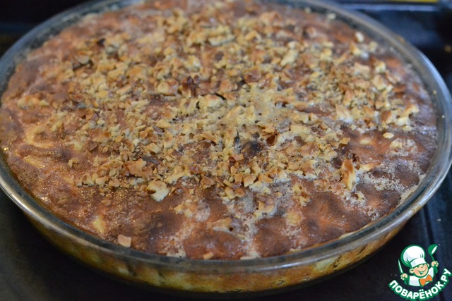 Залить горячий пирог заливкой, посыпать молотыми орехами и допекать пирог еще 10 минут при 220°С