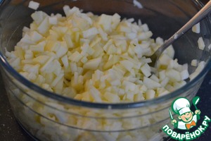 Нарезать на маленькие кусочки, сбрызнуть лимонным соком. Перемешать. -