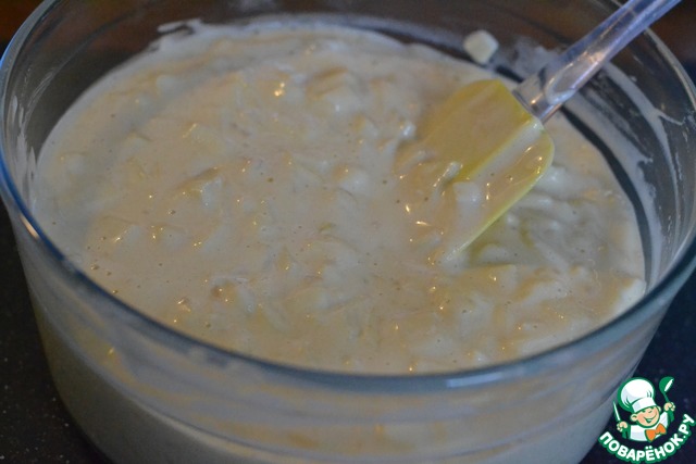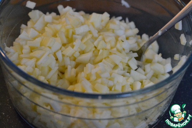 Добавить подготовленные яблоки и перемешать лопаткой.